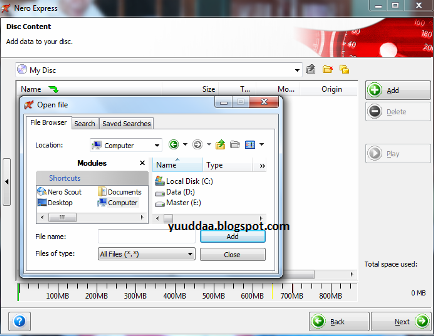 6. Jika ingin menambahkan data yang akan di burning, klik + Add. Jika ingin menghapus data yang sudah ditambahkan, klik - Delete
